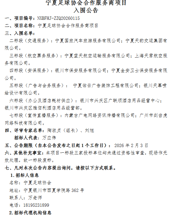 宁夏足球协会合作服务商项目 入围公告