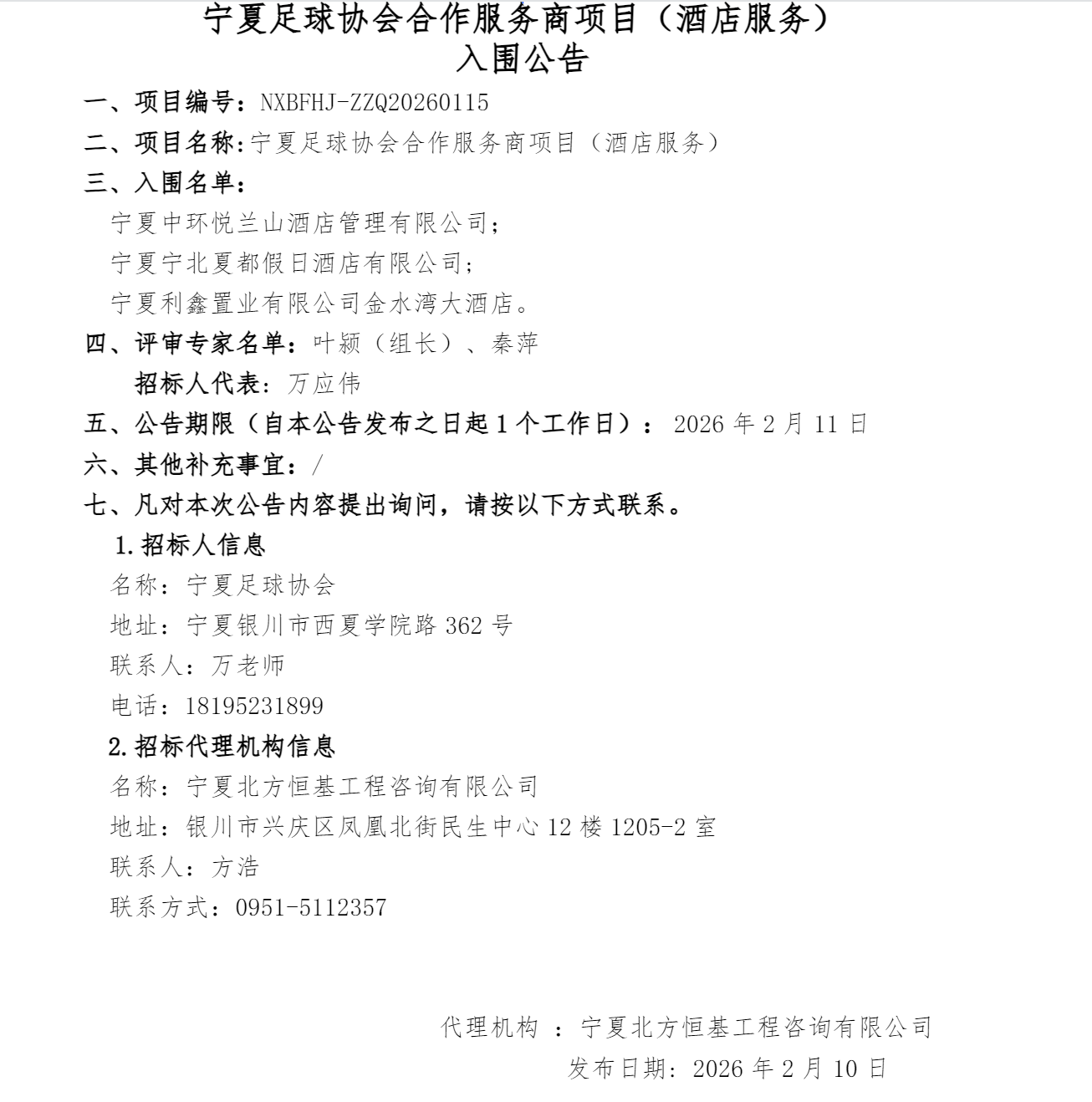宁夏足球协会合作服务商项目(酒店服务)入围公告